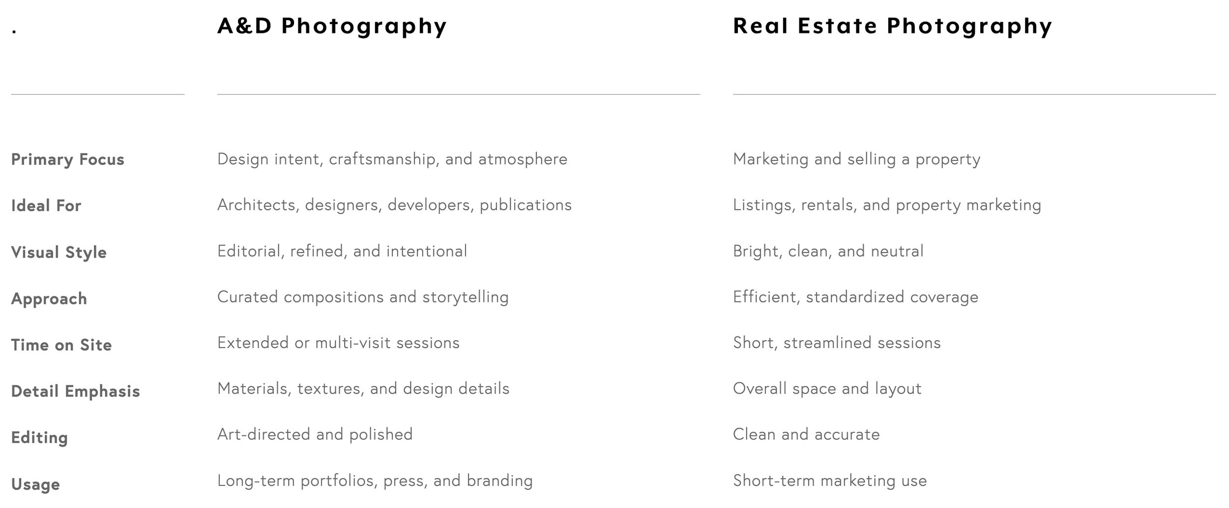Architecture and design photography is about more than documenting a finished space—it’s about translating intent, materiality, and atmosphere into images that endure. This work is created for architects, designers, and developers who need photographs that communicate ideas, elevate their brand, and stand up to long-term use across portfolios, publications, and press. Each project is approached with careful planning, thoughtful composition, and an editorial sensibility, resulting in imagery that reflects not just how a space looks, but how it was meant to be experienced.